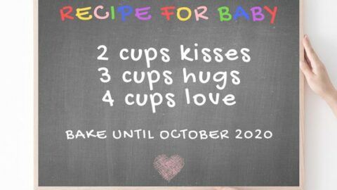 If you are looking for a super simple baking pregnancy announcement, you can use a chalkboard or letter board to make a "recipe for baby" sign like this one.