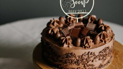 A simple chocolate cake with a fun cake topper is a great way to announce your pregnancy at a family party.