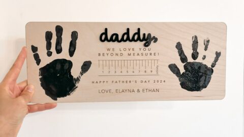 This cute wooden sign is personalizable with your child's handprints, making it the ultimate personalized gift for kids.