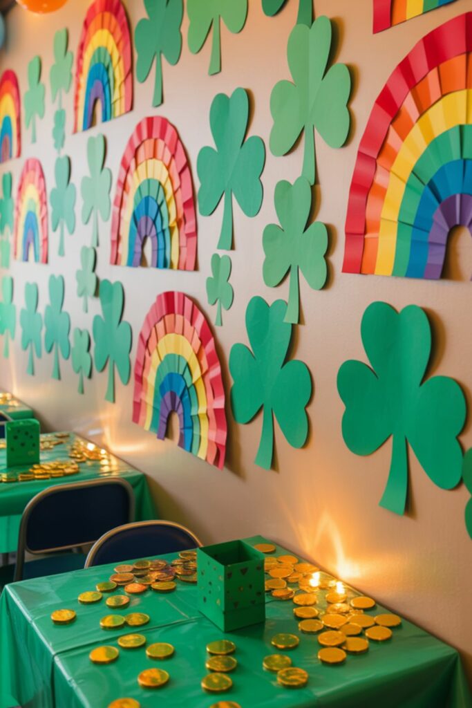 Start with simple decorations like homemade shamrock garlands, green balloons, and a rainbow backdrop made from streamers or construction paper.